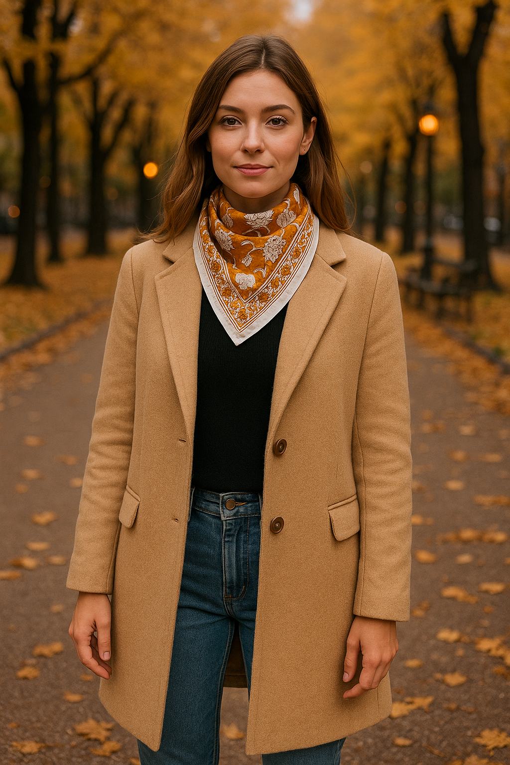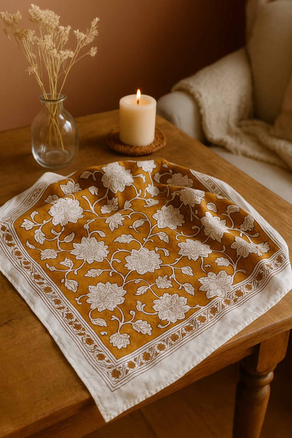 Chaque foulard est une pièce unique, imprimée avec soin à l’aide de tampons sculptés à la main et de teintures naturelles, ce qui lui confère son charme authentique et ses légères irrégularités caractéristiques du fait main.