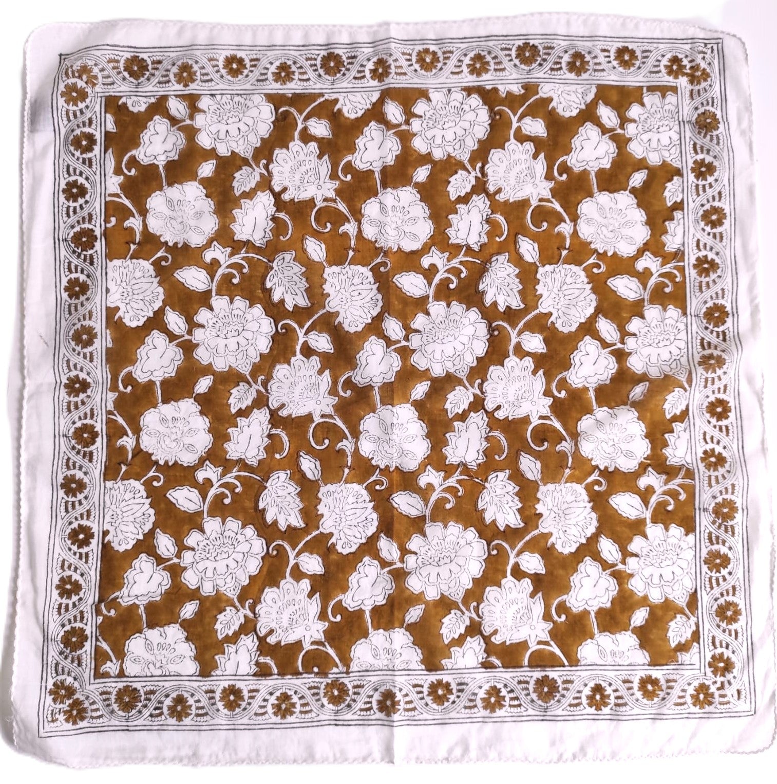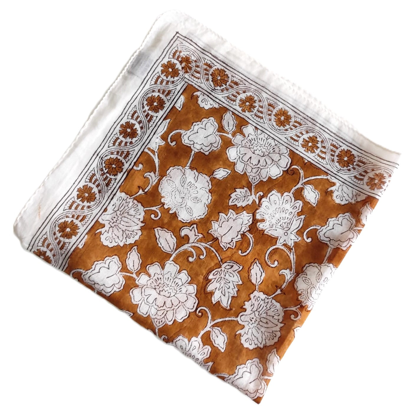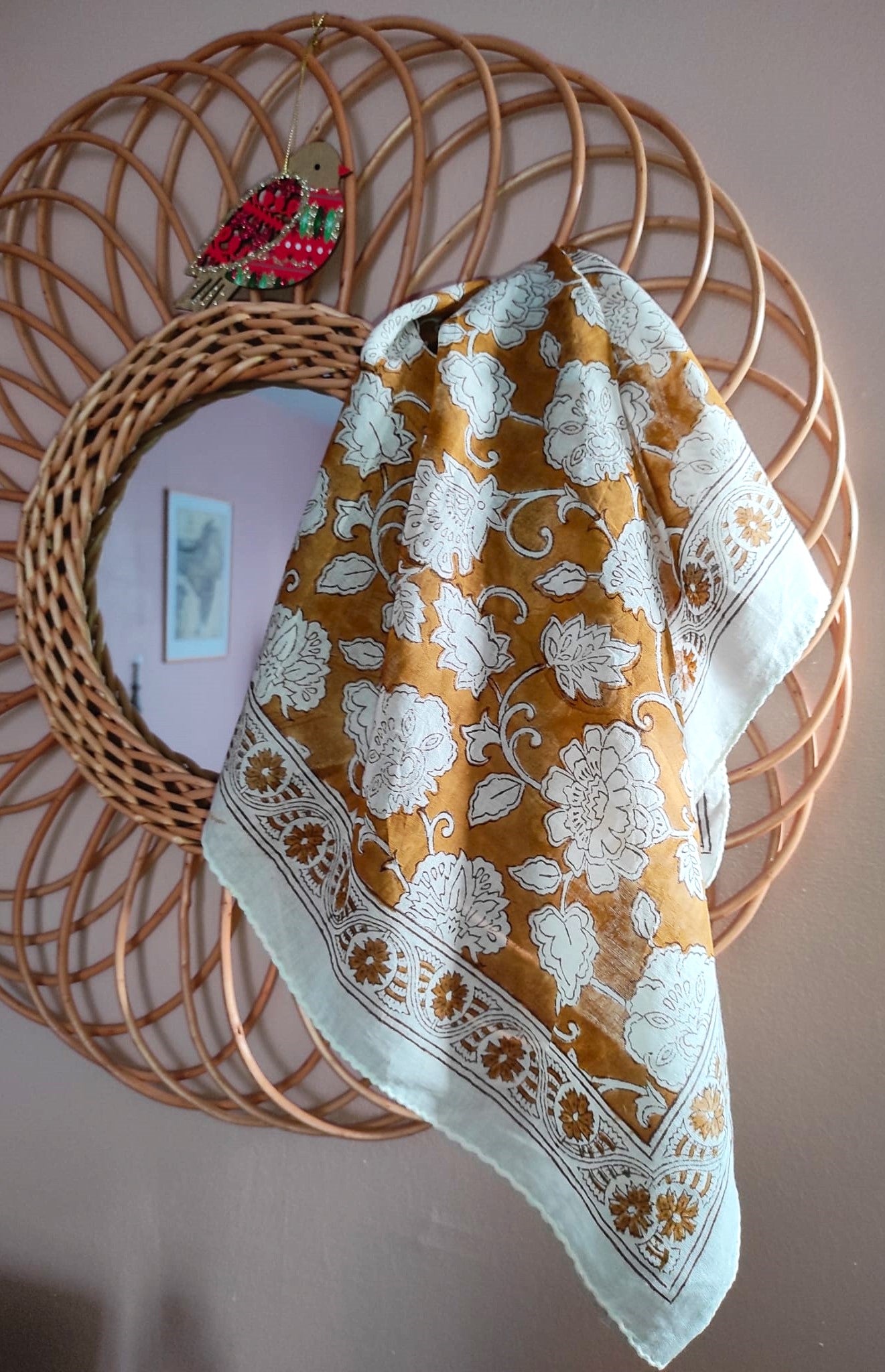 Chaque foulard est une pièce unique, imprimée avec soin à l’aide de tampons sculptés à la main et de teintures naturelles, ce qui lui confère son charme authentique et ses légères irrégularités caractéristiques du fait main.