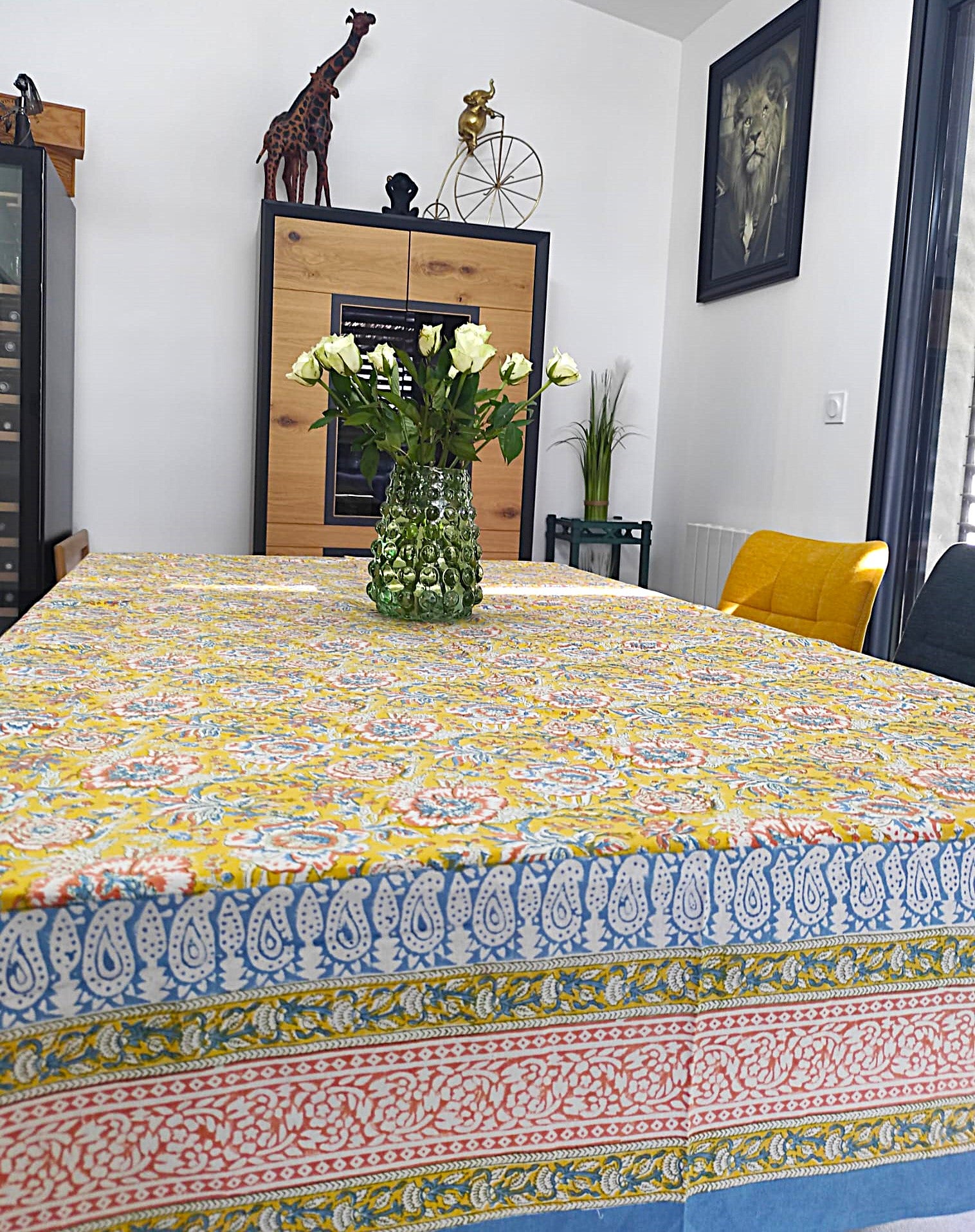 Apportez une touche d’élégance artisanale à votre table avec cette nappe en block print imprimée à la main.
